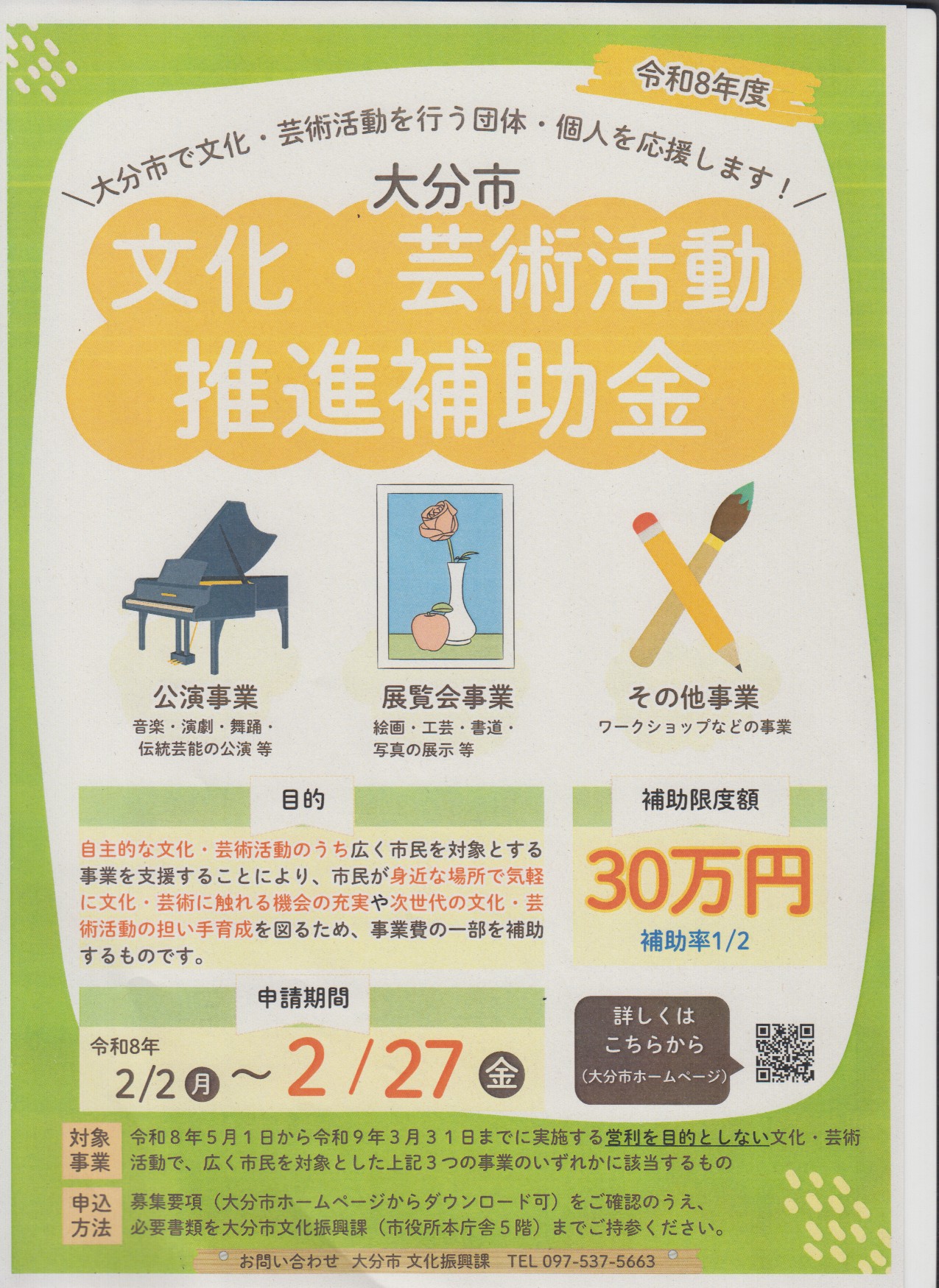 本市では、文化・芸術活動の推進に寄与することを目的に、「大分市文化・芸術活動推進補助金」として、事業費の一部を補助しています。なお、補助対象となる事業は、自主的に行われる文化・芸術活動のうち、広く市民を対象とした事業となります。